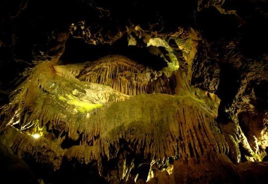 兜率巖位于資興市東江水庫中的一座島嶼上,峭壁臨水,山腰有所廟宇,叫“兜率庵”,庵的后面便是兜率巖洞。兜率巖洞長5公里多,內(nèi)有銅鐘洞、鑼鼓洞、彩石洞等,可謂洞中有洞。期間鐘乳倒垂,天然物象。洞底許多晶瑩透明的細石,用燈光照射,光芒閃爍,宛若天河群星,璀璨奪目。