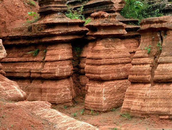紅石林 告別船工后一切便突然安靜下來,過山谷的小路沒有人家,偶爾傳來幾聲清脆的鳥叫。穿過幾座隘口,峰回路轉(zhuǎn)后“石林”漸漸露臉,石頭的顏色是由灰白到棕紅,變幻而又使人聯(lián)想。間或一棵參天大樹,或是綠竹三兩棵,則又是另一番景致了。于高于低、于肥于瘦的石林,于石于樹、于濃于淡的色彩,顯得雄奇又雋秀,并透露出一種清靈飄逸。 這些石柱不但顏色各異,而且大小不等。有的高達(dá)七、八米,而有些則像半埋于地下的巨獸骨架。一位村民告訴記者,現(xiàn)在石林沒有以前壯觀,都長渣子(灌木)了。原因是由于山頂樹木減少,雨水將泥土帶下山,很多石頭都被埋在土下,后來這些地方都開墾了農(nóng)田,石林也被永久覆蓋。 由于泥土覆蓋,石林被切割成一個(gè)個(gè)小區(qū)域,有些隱蔽在果林中,而有些則像突然從天而降,散落田間。