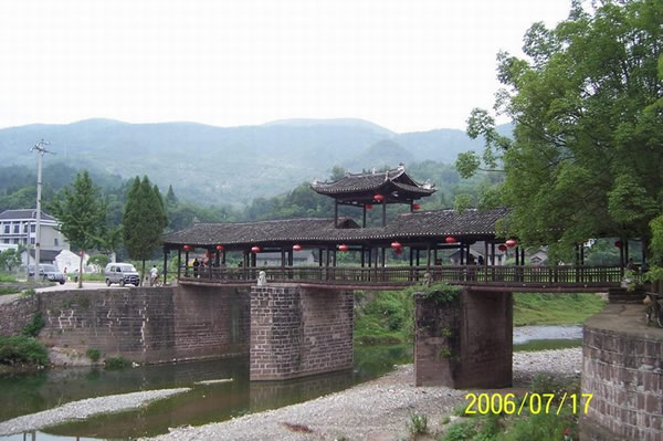 | 賀龍橋原名永安橋,是賀龍曾祖父賀廷宰首倡修建的,它是一座由石墩、木梁、騎廊組成的風(fēng)雨橋。賀廷宰熱心公益事業(yè),見玉泉河“奔流湍急,道路為!,行人十分不便,于是決定修橋。由于他只是一個教私塾的文人,修橋工程艱巨,個人經(jīng)費有限,“至斥腴畝以償其負(fù)”。后來,賀龍的祖父賀良仕子代父勞,費盡心血,終于在1915年修建成功,深獲遠(yuǎn)近鄉(xiāng)鄰稱頌。