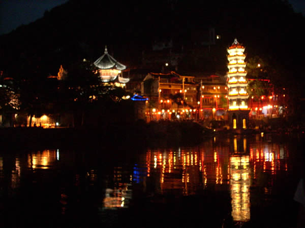 萬名塔 夜景 歷史沿革 萬名塔位于沱江沙灣北岸,與遐昌閣、虹橋相映。集中焚毀廢舊字紙的所在,三層,已毀。八十年代黃永玉召集當?shù)厝四季柚匦逓槠邔,得到縣人民政府和各界人士的響應(yīng),并積極贊助資金,因捐款者甚眾,名為萬名塔。1988年10月建成,耗資5900元。塔內(nèi)外都添設(shè)了燈光,到夜間一片通明,和河兩岸一色的紅燈籠很相稱。塔內(nèi)壁上布滿游客題名,有的甚至位于兩米多高的墻上。 塔用青磚和混合沙漿以及鋼筋混泥土砌筑而成。塔為六方、七級,每層六個翹角,精美秀麗,且懸掛銅制風鈴。塔高22.98米,一層直徑4.5米,向上每層直徑縮小0.3米。塔面裝飾雅致,塔身挺拔秀麗,宛若少女婷婷玉立于沱江之畔。一層有楹聯(lián)六副,皆為名人所題,或頌或感,風格各異。如原縣長吳官林題聯(lián):"塔靜梧高凌空引鳳;河清岸曲流水藏蛟"。民主人士田鶴丹題聯(lián):"喜層層凌云高起;恰悠悠在水一方"。塔身映入沱江碧波之中,搖搖晃晃,顯得格外秀氣動人。
