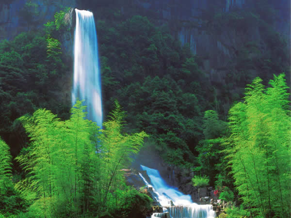 寶峰湖瀑布 湖中有兩座疊翠小島,近岸奇峰屹立,峰回水轉(zhuǎn)。泛舟漫游,只見一湖綠水半湖倒影,充滿詩情畫意!霸铺萑f丈上天臺(tái),高峽平湖一鑒開,王母瑤池金扶,浣沙仙女下凡來”游寶峰湖,你就會(huì)欣賞到這樣的詩情畫意。群峰擁抱的寶峰湖,長約2.,5公里,湖猶如一面寶鏡,四面青山,一泓碧水,蕩槳溫游,格外愜意。坐在船上,環(huán)顧四周,千山聳翠,俯視水中,倒影慢移,碧水照相館得群峰綠,人面桃花水映紅。真是靜極了,美極了!韓劇《九天洞》拍攝的湖水就是寶峰湖。